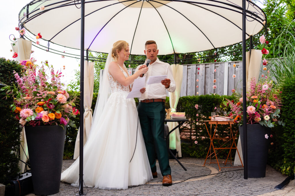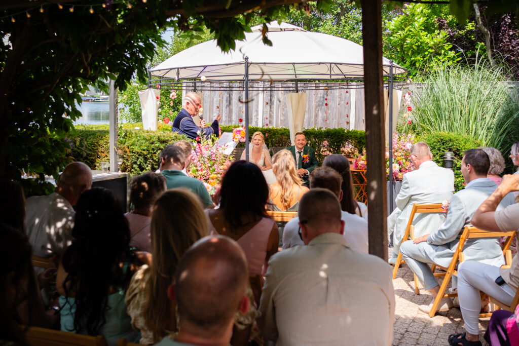 De locatie? De achtertuin van Liza haar ouders, met een waanzinnig uitzicht op de Binnenmaas. Deze plek werd omgetoverd tot een intieme, persoonlijke trouwlocatie. De tuinbruiloft.