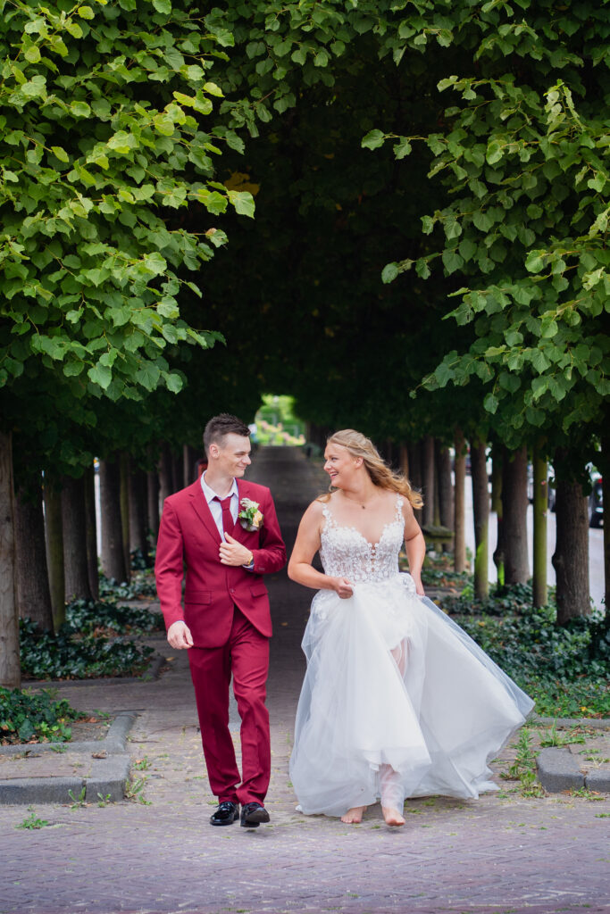 Toen we door de straatjes liepen, merkte ik meteen dat Mickey en Carina helemaal op hun gemak waren. De spanning van de ceremonie was voorbij, en nu konden ze echt even samen zijn en genieten van het moment. Hand in hand slenterend over de kasseien, lachend, kussend en elkaar aankijkend met die blikken die zeggen: “Dit is onze dag.” Dat soort momenten zijn voor mij als fotograaf goud waard – puur, spontaan en vol emotie.